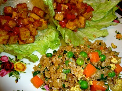 Preheat a skillet over medium heat. Sauté the shallot, garlic, and ginger in the sesame oil for about 2 minutes. Add the rice and drizzle in the soy sauce. Toss to coat completely, add carrots, peas and tofu egg, and cook for about 3 minutes more, until the rice is uniformly browned. Stir in the green onion, and serve.
