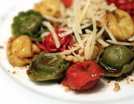 Transfer the ravioli to the pan saucepan with the balsamic brown butter. Sprinkle walnuts and Parmesan over the top. Serve immediately.