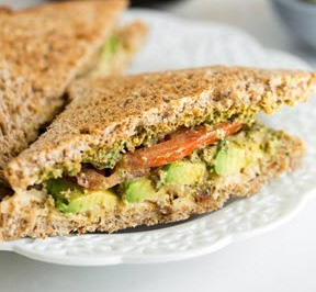 3. Spread bread with hummus and pesto (one on each). Layer on the avocado, tomato, and lettuce. Sprinkle on red pepper flakes, salt, and pepper. Slice in half and enjoy!