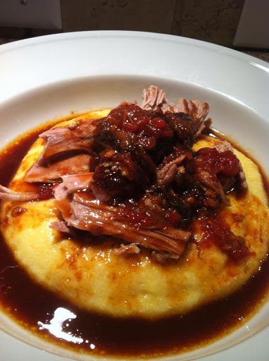 Remove pork from pan, drain all but 2 tablespoons of fat from pan. Sautee onions until translucent. Add remaining ingredients, return pork to pan, bring back to boil. Put lid on pan, put in oven pre-heated to 350 for approx. 4 hours or until fork tender.