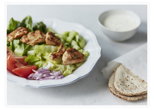 2. To make the tzatziki dressing: shave or grate one clove of garlic into a small bowl with the minced cucumber. Add the yogurt and the juice of a whole lemon. Drizzle in about 3 tablespoons of olive oil while whisking. Add salt and pepper to taste. Set aside.