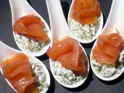 Cortarlo laminado y servir. Yo preparé una crema de queso rápida, con los ingredientes que anteriormente comenté. Lo puse en manga pastelera. Lo serví en las cucharitas con una lonchita de mi rico salmón!!