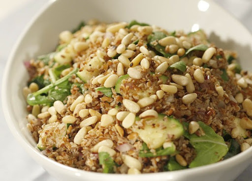 4. When ready to serve, stir in the lemon juice and olive oil and season to taste with salt, more lemon juice or olive oil, and black pepper as needed. Fold in the arugula leaves and transfer the mixture to a serving bowl. Sprinkle the toasted pine nuts over top and serve. This makes about 6 cups salad.