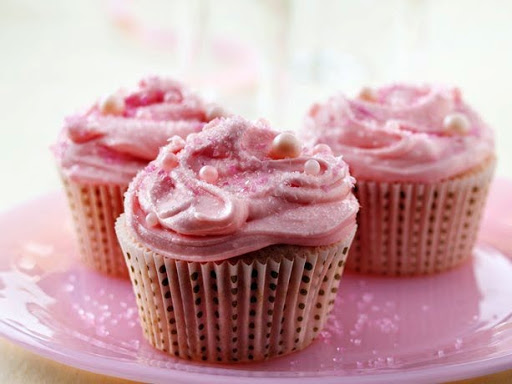 In medium bowl, beat frosting ingredients with electric mixer on medium speed until smooth. Frost cupcakes. Sprinkle with pink sugar and pearls.
