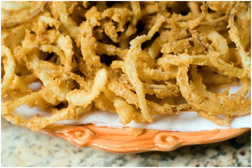 Grab a handful of onions, throw into the flour mixture, tab to shake off excess, and PLUNGE into hot oil. Fry for a few minutes and remove as soon as golden brown.