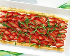 It’s amazing how ingredients that are in season at the same time go so well together. Mint and strawberries are a natural pairing and this pretty dessert highlights both flavours, particularly with the vanilla accent. Weighing down the puff pastry when baking prevents it from puffing too much and creates a crispy base. It is nice to present a whole dessert, but because of the crisp pastry, this one is best cut into slices on a cutting board and presented on individual serving plates. Serve it with a knife and fork for easier eating. Double the recipe for more servings but be sure to bake the pastry bases separately for even browning.