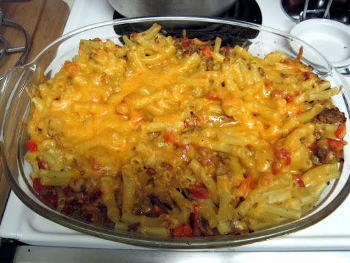 Drain pasta and add it to your sauce. Pour into a greased baking dish. Sprinkle cheese on top. Bake at 350 for 30 minutes.