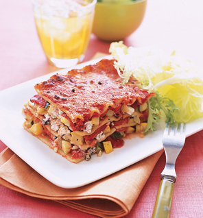 Heat oven to 375°F. Mix goat cheese, olives, thyme, basil, oregano, and garlic in a bowl; season with salt and pepper. Spread 1 cup pasta sauce on the bottom of an 8" x 11" baking dish. Add one layer of lasagna and season with black pepper. Add a layer of zucchini, squash, and red pepper. Dollop spoonfuls of goat cheese mixture over vegetables and spread to cover. Repeat layers, finishing with pasta and sauce. Sprinkle Parmesan on top, cover with foil and bake 40 minutes. Uncover and bake 5 minutes or until top browns. Let stand 10 minutes; serve.
