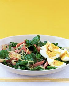 2. In a large bowl, combine spinach, ham, and radishes. Drizzle onion mixture over salad, and toss to coat evenly. Garnish with hard-cooked eggs, and serve.