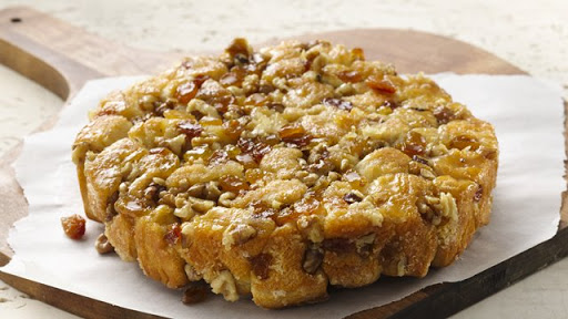 3.Bake 20 to 25 minutes or until deep golden brown. Run knife around side of pan to loosen. Place heatproof serving plate upside down over pan; turn plate and pan over. Remove pan and waxed paper. Cut coffee cake into wedges or pull apart. Serve warm.