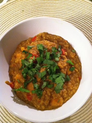 Add 7 cups of water and lentils. Bring to a boil, reduce to a simmer, cover, and cook 10 minutes. Add potatoes and continue to cook, covered, until lentils and potato are just tender, about 15 minutes.