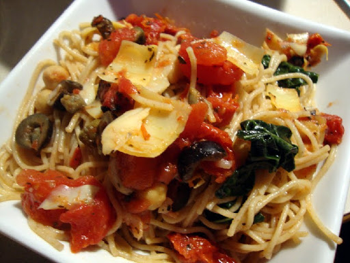 In the same pot, heat 2 tsp of the oil over medium heat. Add the garlic and cook until fragrant, 30 seconds. Stir in both kinds of tomatoes, chickpeas, artichoke hearts, olives, capers (if using), basil, and salt and pepper to taste. Cook until hot, about 5-8 minutes. Add the reserved pasta and toss gently to combine and heat through. Serve hot, sprinkled with pine nuts, if using.