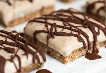 Chocolate drizzle: When the middle layer is completely solid, prepare the topping. In a small pot heat the chocolate and coconut oil on the lowest heat, stirring to combine. When half of the chips have melted, remove the pot from the heat and stir until completely melted. Remove the bars from the freezer. Lift slab out of the pan and slice into squares. Spread out the squares on a plate lined with parchment paper. Drizzle on the melted chocolate and return bars to the freezer until the chocolate is firm and the bars are solid.