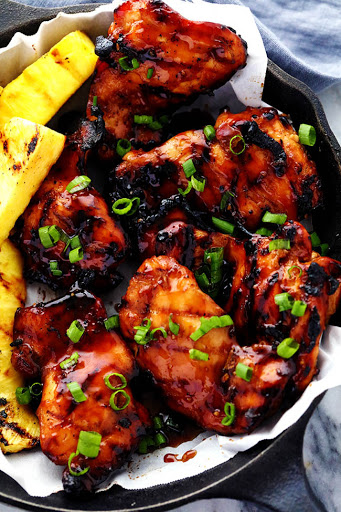 In a medium sized bowl, whisk together pineapple juice, soy sauce, brown sugar, ketchup, chicken broth, ginger and garlic. Reserve 1 cup sauce for basting. Add the chicken thighs and sauce to a ziplock bag and marinate at least 3 hours or overnight.