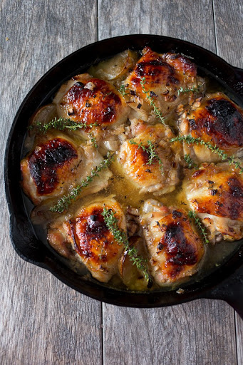 After the chicken has marinated preheat your oven to 400 degrees, add chicken to a large cast iron skillet or 9x13 baking dish and arrange apple slices and thyme sprigs around the chicken.