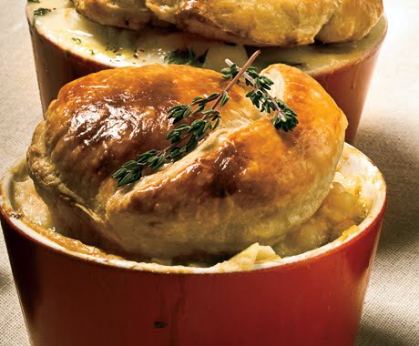 Divide hot filling among four 1 1/4-cup baking dishes. Top each with pastry round. Bake until filling bubbles, about 5 minutes.