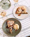 On a lightly floured work surface, roll out the pastry to a 15-inch round, about 1/8 inch thick. Transfer to a baking sheet and refrigerate for 15 minutes. Brush the egg wash in a 2-inch band around the edge of the dough. Spread the apples on the pastry; add any pan juices to the bowl. Fold the border up over them, leaving the center exposed. Sprinkle the streusel topping over the apples in the center and brush the pastry with the egg wash. Bake the crostada for 50 minutes, or until golden brown. Let cool slightly, then serve with vanilla ice cream drizzled with the reserved pan juices and maple syrup.