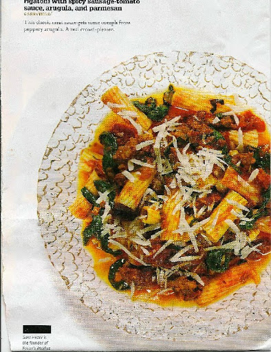 Rigatoni with Spicy Sausage-Tomato Sauce, Arugula and Parmesan