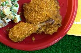 Remove chicken from the marinade, letting the excess drip off, and dredge through the corn flake-Parmesan mixture, pressing to help it adhere.