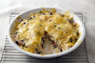 SPOON 1/3 of the chicken mixture into 9-inch pie plate; top with 1 tortilla, half the remaining chicken mixture and 1/4 cup shredded cheese. Cover with second tortilla, remaining chicken mixture, 1/4 cup shredded cheese and remaining tortilla. Top with remaining cooking creme and shredded cheese; cover.