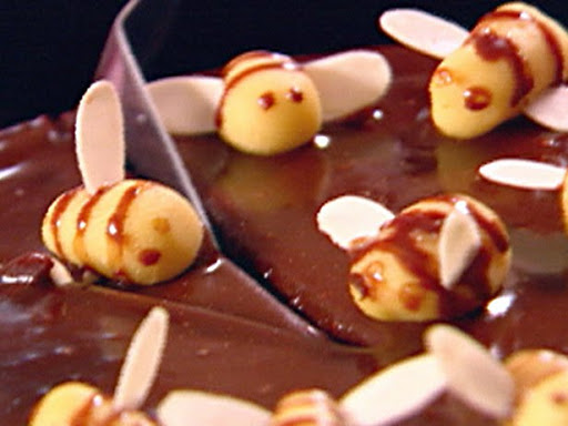 Using a wooden skewer, paint stripes with the sticky honey glaze left in the pan from icing the cake. About 3 stripes look best, and then very carefully attach the flaked almonds at an angle to make the bees' wings, 2 on each one. They might snap as you dig them into the marzipan bodies, so have some spare. I'm afraid to admit, I also like to give them eyes by dipping the point of the skewer in the glaze and thence on the bees: they look more loveable with an expression, which is somehow what the eyes give them, but then this is where the Disney effect comes in. If a more imperial dignity is required, forgo the dotting of the eyes and present this as your Napoleonic Chocolate Cake.