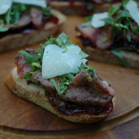 Grill the beef tenderloin, turning to mark all sides, until medium rare, about 10 to 15 minutes total. Let rest for 10 minutes, then thinly slice the meat. Place a slice of beef on each rosemary focaccia crostini and top each with a teaspoon of onion marmalade.