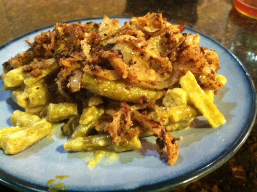 Top with onion mixture and heat at 325 ˚F in an oven until topping starts to crisp (but not burn!) and green beans are heated.