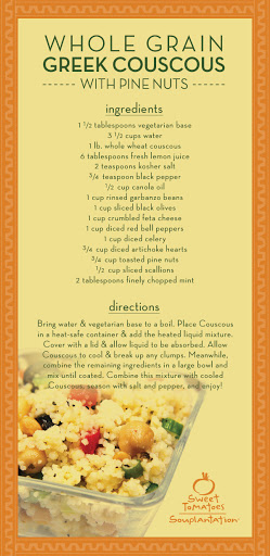 Bring water and vegeterian base to a boil. Place cous cous in a heat safe container and add heated liquid mixture. cover with lid and allow liquid to be absorbed. Allow cous cous to cool and break up any clumps. Meanwhile combine all other ingredients in large bowl and mix until coated. Combine mixture with cooled cous cous.
