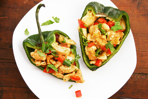 Place the poblano halves, cut side up, on a serving platter or plates. Spoon the chicken mixture over the peppers, sprinkle with cilantro, and serve.