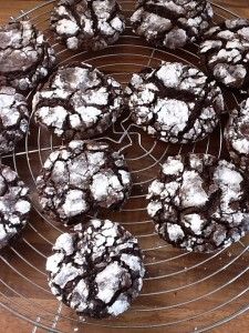 4. Preheat the oven to 350ºF (176ºC). Get your powdered sugar in a cereal bowl and the dough out of the fridge. Start rolling tablespoon sized balls between the plams of your hand (this will get sticky) then roll the ball in the powdered sugar and place it on an ungreased cookie sheet (repeat until you are out of dough).