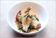 2. Reduce the heat to medium-low, add the shallots to the pan, and sauté until tender but not browned, 2 to 3 minutes. Add the cornichons, brine and vinegar, raise heat and bring to a simmer. Return the rabbit legs to the pan with any accumulated juices. Add enough chicken stock to come to within about 1/2 inch of covering the legs. Bring to a boil, then remove from heat.
