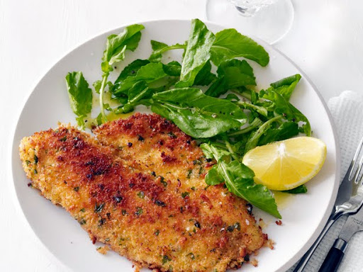One at a time, remove the fillets from the milk and dredge in the flour, then eggs and then breadcrumbs. Transfer to large plate and let set 1/2 hour.