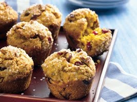 in large bowl, mix flour, sugar, baking powder, cinnamon, ginger and salt. stir in pumpkin, oil, eggs, cranberries and pecans just until moistened. divide batter evenly amoung muffin cups. sprinkle course sugar evenly over batter in each cup.