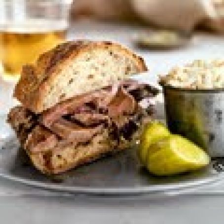 3. Slice meat and assemble sandwiches with bread; if desired, add horseradish to taste. Serve with coleslaw and pickles.