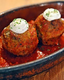 6.Serve: Preheat oven to 350 degrees. Spoon tomato sauce evenly over meatballs and transfer to oven. Bake until heated through, 10 to 15 minutes. Top each meatball with a tablespoon of ricotta cheese (it should look like it is oozing from the center) and sprinkle with Parmigiano; return to oven and heat for 3 minutes. Serve immediately.