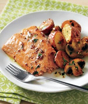 4. Roast until the salmon is opaque throughout, the mushrooms are tender, and the potatoes are golden brown, 12 to 15 minutes.