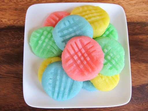 Color dough by adding few drops of food coloring to each portion of dough. Shape the candies into rounds of about 1/2 tsp each. Score with fork.