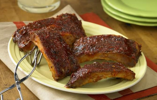 “Spicy ribs turn up the heat any day with both a Cajun-seasoned dry rub and a fiery-sweet basting sauce.”