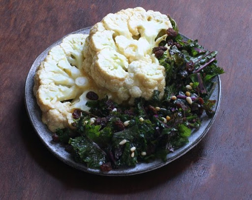 4. To serve: Set cauliflower on serving plates. Arrange Kale Salad around cauliflower, drizzling any remaining dressing or miso marinade over top. Garnish with pine nuts, sea salt, and raisins (if using).