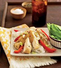 3. Slice chicken and serve with rice and peanut sauce. Garnish with red pepper and scallions. Serve with snow peas.