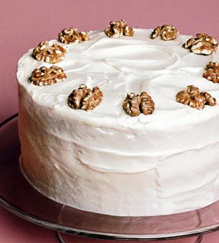 Using serrated knife, trim off domed top of each cake layer, creating flat surface. Place 1 cake layer, trimmed side up, on platter. Spoon 1 cup frosting in dollops over top of cake layer; spread evenly to edges. Top with second cake layer, trimmed side down. Spread remaining frosting evenly over top and sides of cake. Arrange walnut halves around top edge of cake. DO AHEAD Can be made up to 1 day ahead. Cover with cake dome and chill. Bring to room temperature before serving.