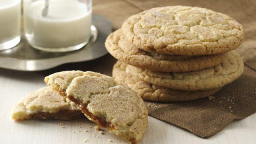 2 Heat oven to 350°F. Lightly grease or spray cookie sheet. In large bowl, break up cookie dough. Stir or knead in flour until well combined. Form dough into 9 balls. Flatten each ball into 2-inch round; place 1 frozen dulce de leche dollop on center of each round. Shape dough around dulce de leche, sealing to cover completely. In small bowl, mix sugar and apple pie spice. Roll each ball in sugar mixture. Place 1 inch apart on cookie sheet.