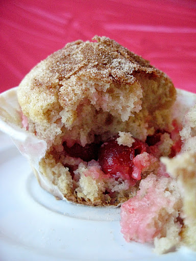 6. Fill greased muffins tins or muffins cups half full. Place 2-3 cherries on top and then cover with more batter.