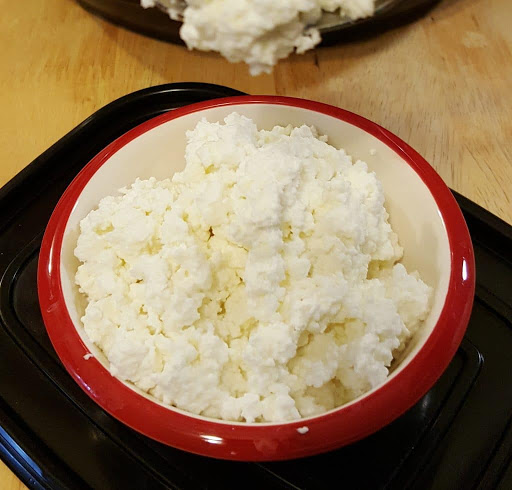Pour the Cottage Cheese into a Strainer Basket, sitting inside of a Cooking Pot or other device to catch the Whey. Remove Strainer Basket to sink and run a slow stream of cool water over the Strainer Basket to remove excess Vinegar. Place Cottage Cheese into bowl. Pour Salt/Cream into bowl and gently incorporate.