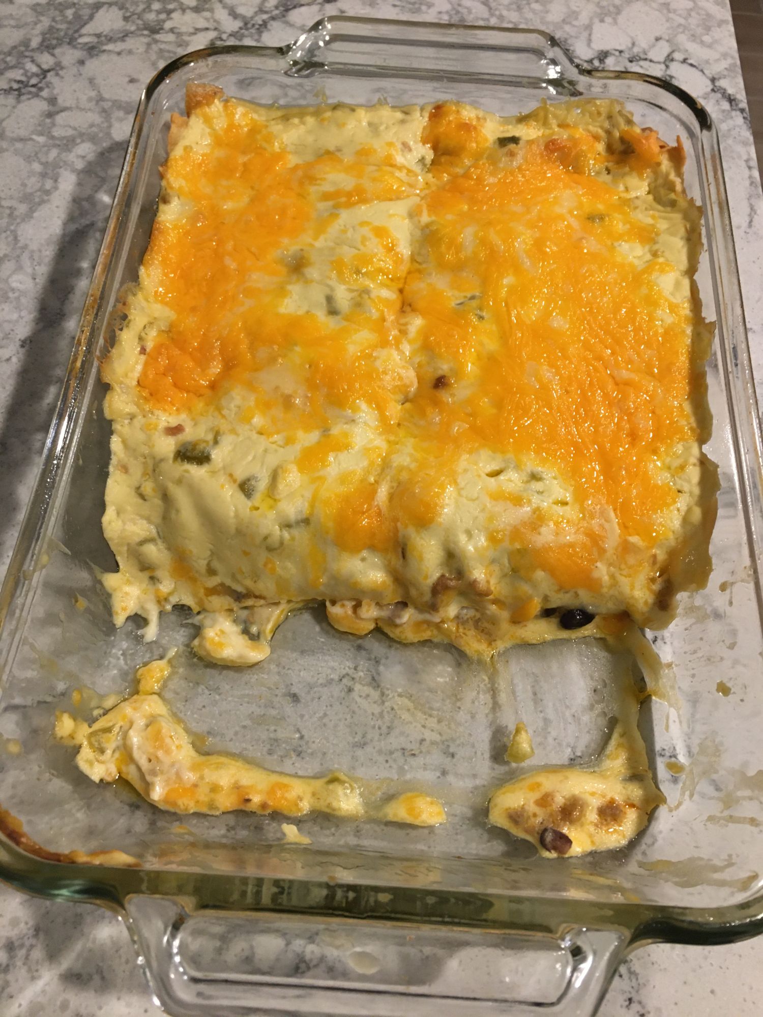 Preheat oven to 350. Cook ground turkey and add taco seasoning with a little water. Stir until all meat is coated with taco seasoning. Set aside. In a saucepan mix soup, green chili’s, and sour cream until heated. Add broth to thin to correct consistency. Take tortillas and spread meat, sprinkle some black beans and both cheeses then roll up and place seam side down in a casserole dish. Spread sour cream mixture over rolled tortillas and sprinkle a generous amount of both cheeses on top. Bake until bubbly.