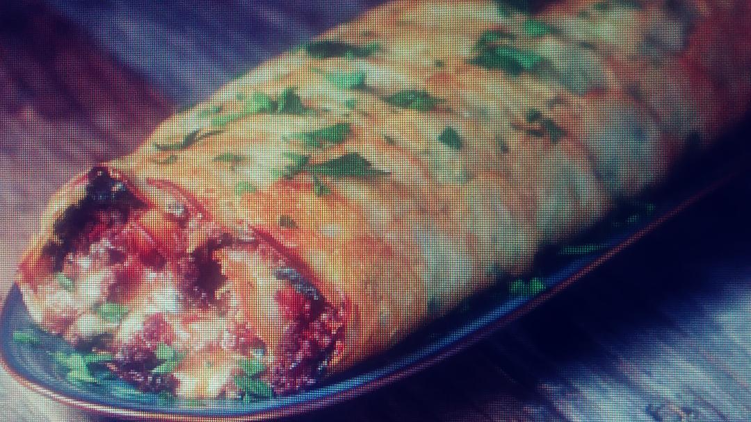 Take one end of the potato sheet holding the parchment paper begin rolling upward, making sure the ingredients are not coming out the ends.
