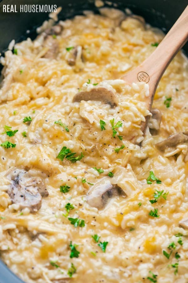 30 minutes before done, add in sliced mushrooms and finish cooking. Once done add in cooked rice and cheese. Cover and let sit 5 minutes for cheese to melt, stir and garnish with parsley. Serve warm.
