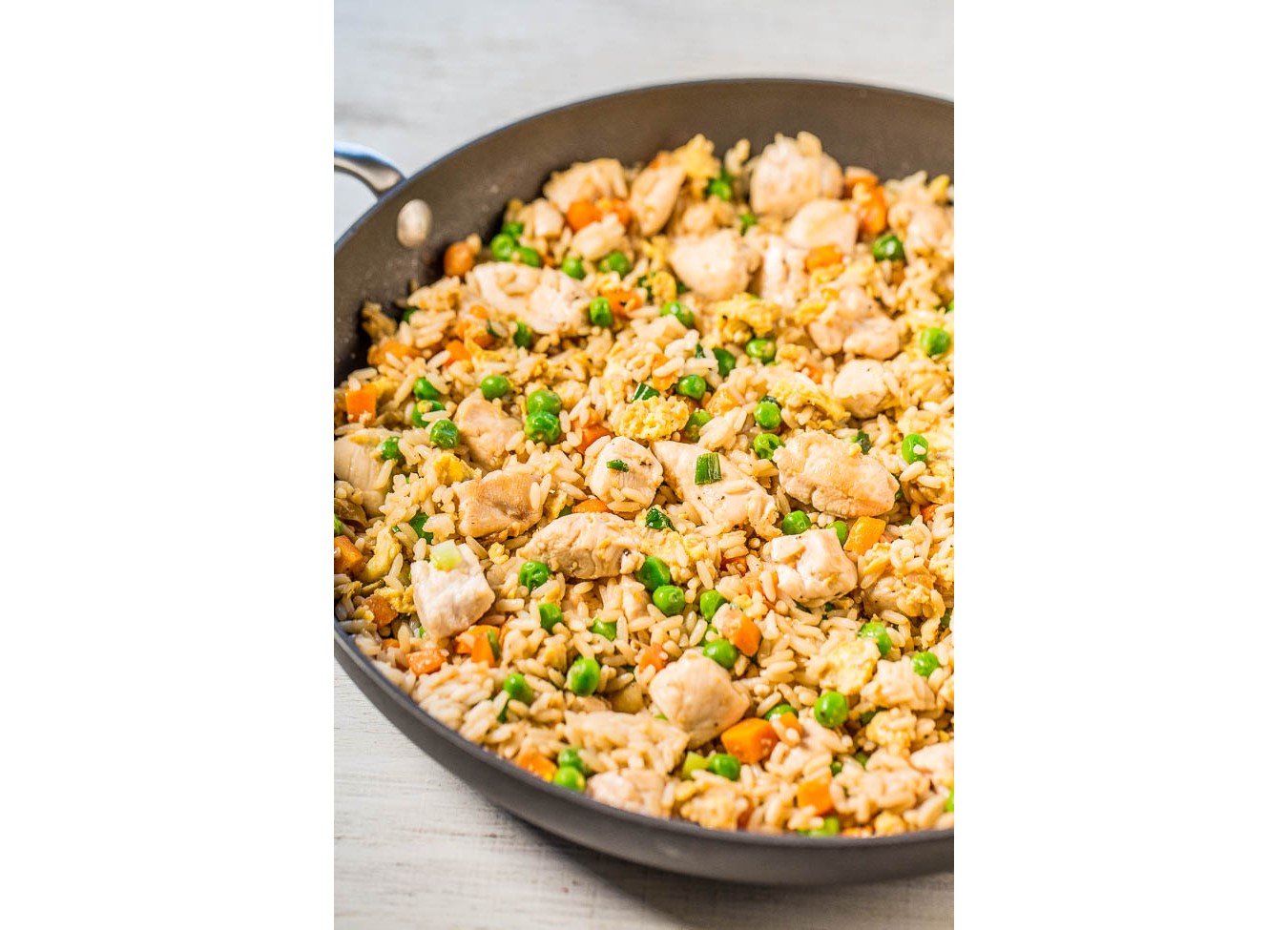 Add the chicken, rice, evenly drizzle with soy sauce, optional salt and pepper, and stir to combine. Cook for about 2 minutes, or until chicken is reheated through.