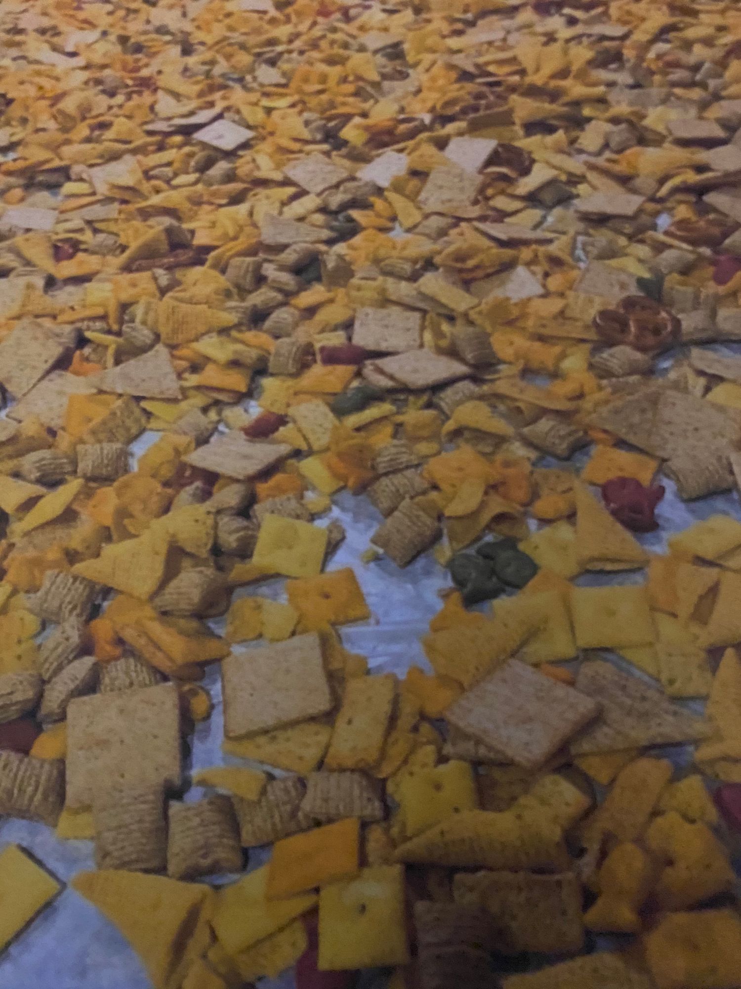 Put 1/2 the crackers in a garbage bag. Sprinkle 1/2 the Hidden Valley and shake. Put rest of crackers and rest of dressing and shake a little more to mix. Start pouring some of the oil and shake. Continue mixing in oil til gone. Let dry on cookie sheets or counter. Then can freeze. Can add cheetos when serving. They will get stale in the freezer.