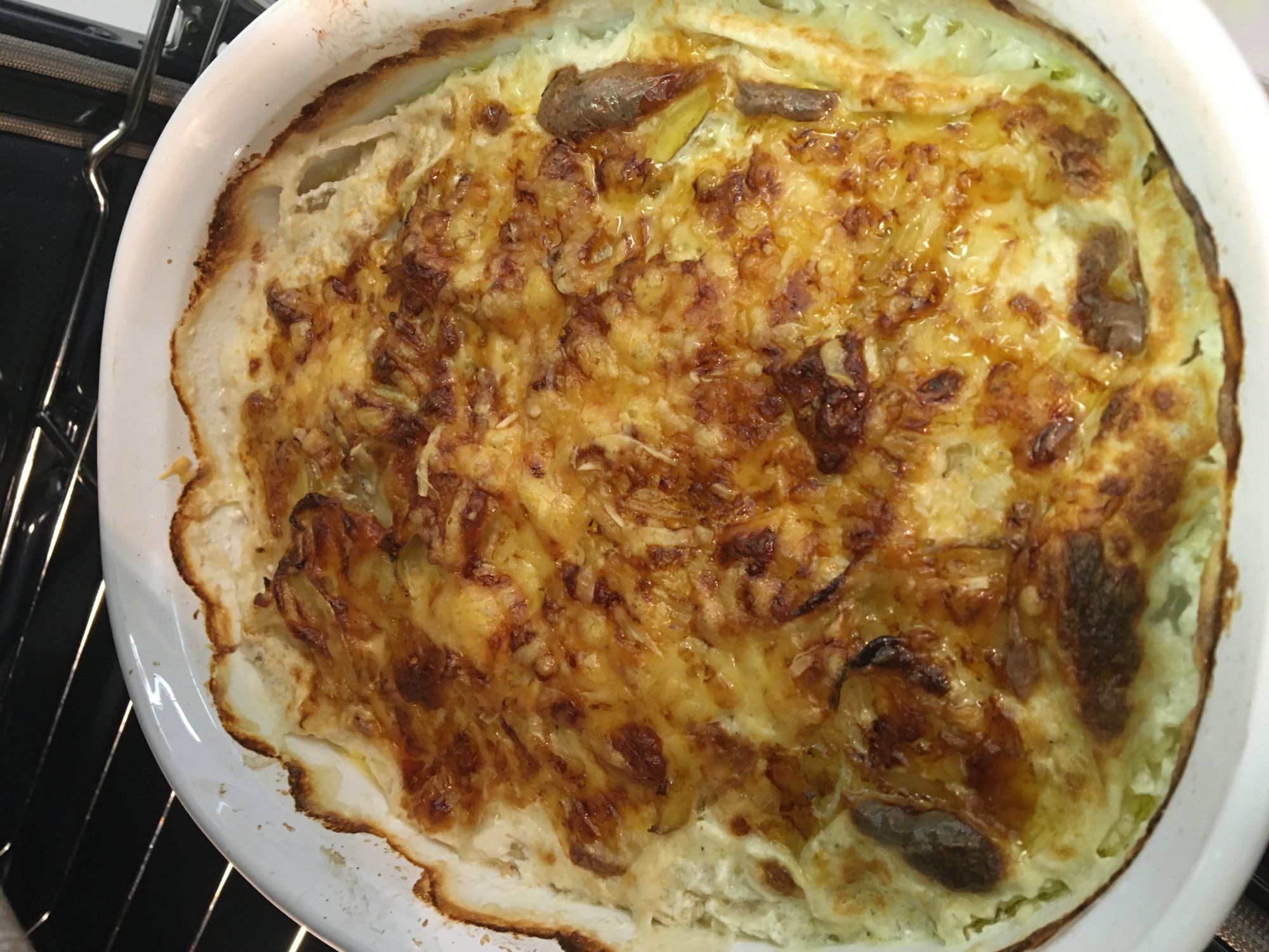 Top the casserole with the remaining potato slices. Add the half and half. Dot the potatoes with the remaining 1 1/2 Tbsp of butter.